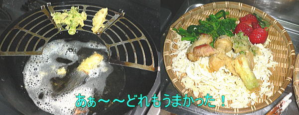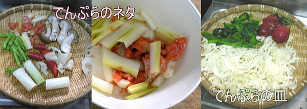 野菜はいろいろ、鮭はセロリとかき揚げ、付け合せはイチゴと菜の花。