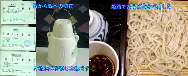 左から野辺山⇒野里の切符、小淵沢駅のお茶、姫路で食べたそば、という具合で帰ってきました。