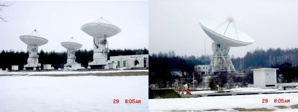 ると一面雪景色、野辺山はまだまだ冬、電波望遠鏡も雪の中でした。