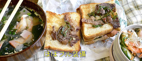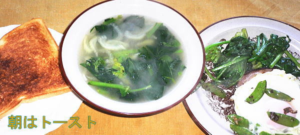 ほうれん草と炒めてサンドィッチ、スープは袋入りです。