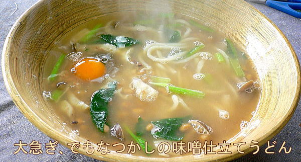 冷蔵庫に住んでいた)ふとうどん味噌仕立て。梅雨空で肌寒く、味噌