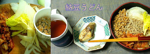 帰ってきて早速そば、納豆とキムチ、浅漬けから出た汁をかけて食べ