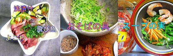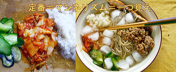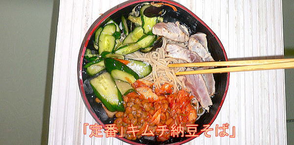 け合せ、納豆、キムチ、レタス葉千切り、これにそばを載せて、浅漬けか