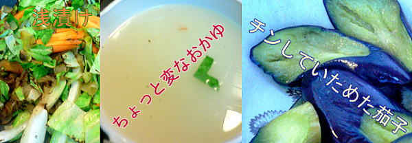 としています。味はおかゆみたいです。付け合せはお茄子、今日のはな