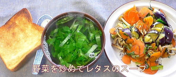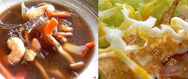 ら出た汁をかけます。右はスープの実むきえび、人参、レタスの硬い葉