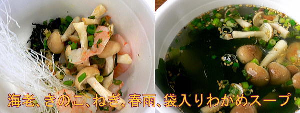 きのこ、春雨、それに袋に入ってわかめスープです。