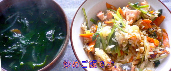 鮭の切り身を刻んで、炒めご飯に混ぜました。スープはいりこだし、