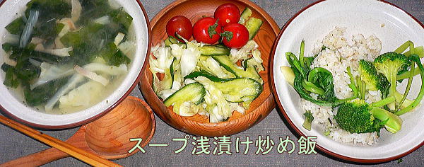 で炒め飯、きゅうりとキャベツの浅漬け、大根わかめベーコンでスープ、