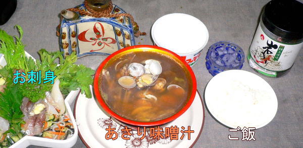 中心部分の軟らかい葉にのせて、あさりは大根、玉葱と味噌汁に、ご