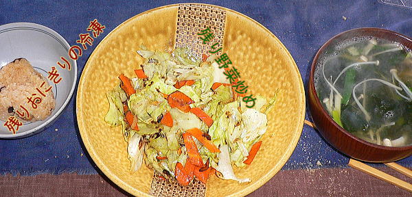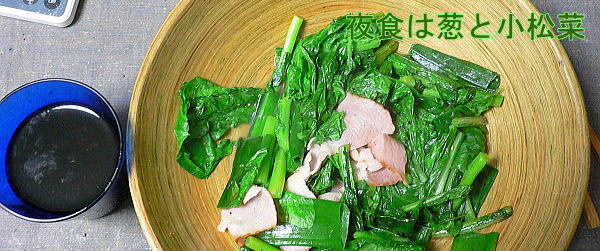 あっそうだ、帰りチョッと遅かったのですが朝来の道の駅で野菜が買えたので、安売りと相俟ってこうやって豪華に食べているのです。夜食には小松菜と葱をおごっちゃいました。なんて幸福!おじさんおごるなかれ(?) |