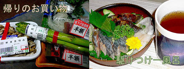 自然学校の帰りが8時近くなっちゃったので、いろんなものが安売りになっていました。刺身もたっぷり、お風呂でゆっくり食べました。 |