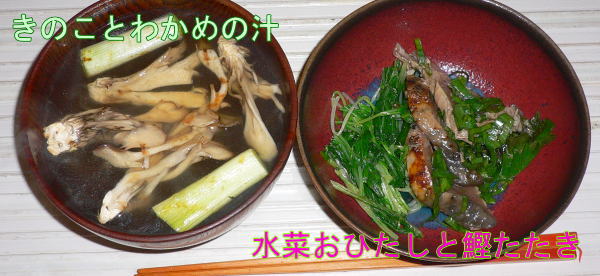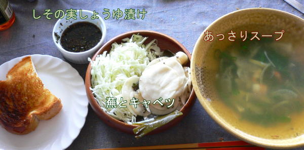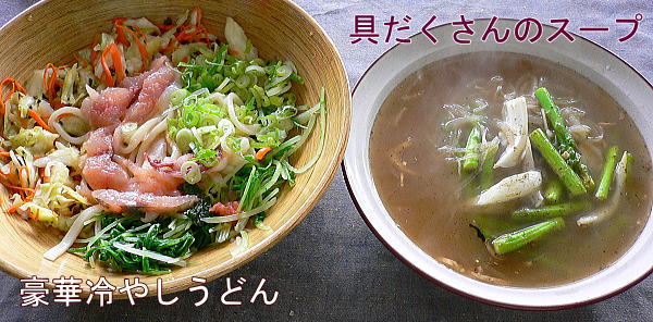 前に時々「パジャマ脱がない」宣言をして一日家にいる日がありましたね。今日はその日なんです。昨日の残り刺身と冷やしふとうどん、野菜は一部生、大部分浅漬け、おひたしも少しで、浅漬けから出た汁をかけました。スープは焦げ玉葱味プラス具だくさん。2椀ですが豪華、大満足の昼食で舌。 |