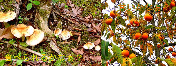 さすがは秋、自然学校では食べられそうなものがいっぱい。でも毒かな?渋いかな?何百万年も昔から先祖がやったと同じ悩みで写真をとりました。 |