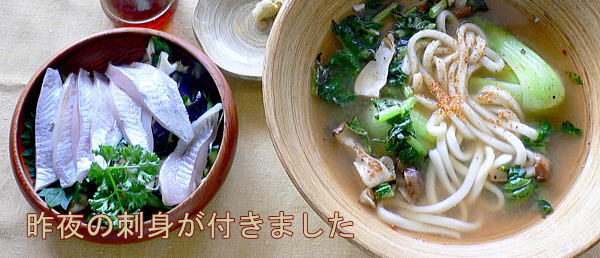 伊丹発最終便、ゆっくりなのでゆっくり起きてまたまた味噌うどんです。昨夜買ってきたけれど何故か食べそびれたお刺身をつけました。 |