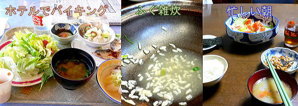鹿児島では来年2月の日フィルのコンサートに向けての協力をたのんで歩くのが目的です。朝早く空港で待ち合わせ、空港ホテルの朝食バイキングは思わずたくさん取ってきて食べちゃいました。昼食は彼方此方移動中の忙しいふぐ雑炊、これも結構楽しんじゃいました。夜は鹿児島の仲間たちと計画やら実行やら相談やら宴会やら、忙しい一日のあと面高家にご帰館、チョッと呑んで話して忙しく朝食、空港に飛びました。 |