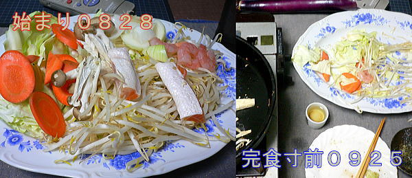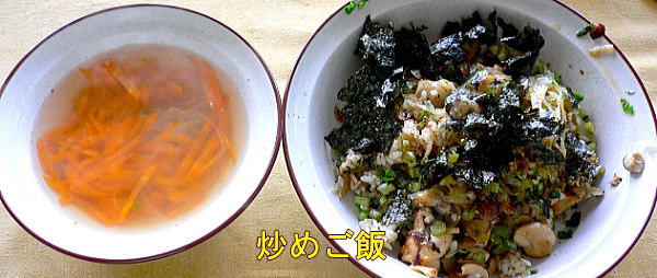 姫路の暮らし第2日目です。ゆっくり休んでホームページを追いつかせる作業、もうお昼近くなって残り野菜をご飯と炒めて海苔をかけた朝食です。 |