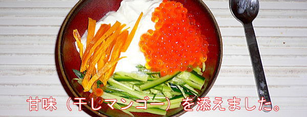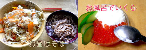 ゆっくりテレビを見たりして、プールにいきました。お昼といっても5時近く、おそばを野菜炒めと食べました。運良く生筋子が売っていたので、買ってきてさばきました。これがお昼の代わりになっ茶いました。 |