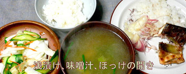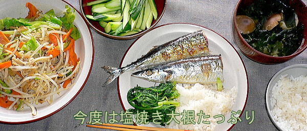 もう10時、とても昼飯とはいえません。ホッケの開きが2枚で600円、それが「半額」札がついているんです。細かくして冷凍しました。いつでも困りません。 大根たっぷりと茗荷、みそ汁はたっぷりの鰹2番だし、キャベツ大根きゅうりの浅漬け、夕食というより夜食に近い昼飯でした。 |