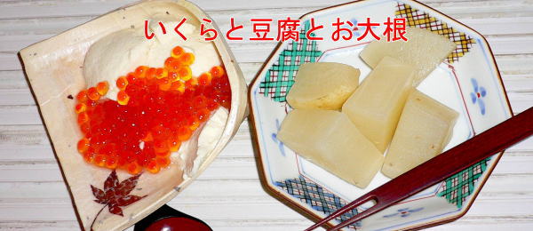 いくらがまだ残っています。お豆腐との組み合わせもいいですね。大根は、お腹だけ食べちゃったさんまの残りで煮ました。濃厚なだし、少し歯ごたえを残しました。これもいいもんです。 |